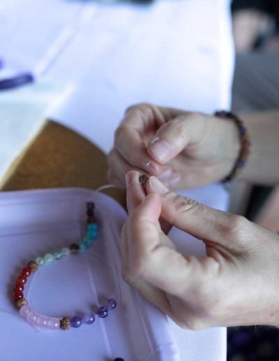 All materials are provided (beads, crystals, threads, sterling silver OM charms) so everyone takes home a beautiful handmade bracelet.