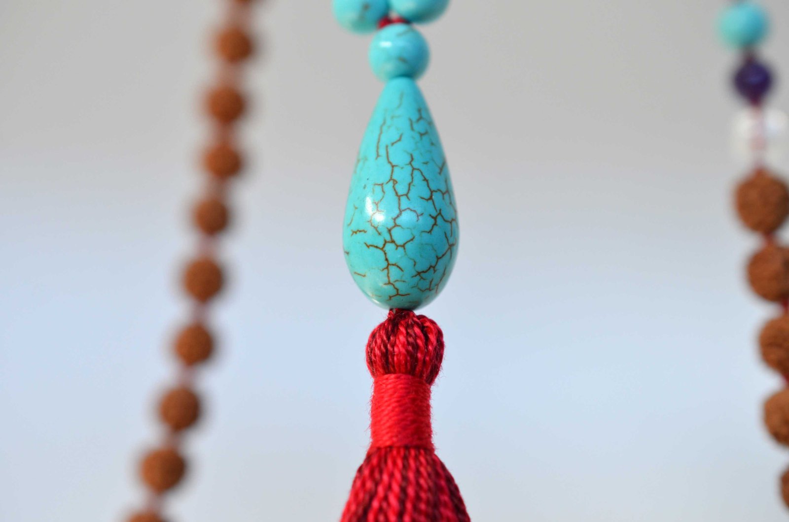 108 beads at 7 mm each. This Mala hangs 40 cm. Length is approximate as each piece of jewellery is unique. The colours may vary due to different monitor settings.
